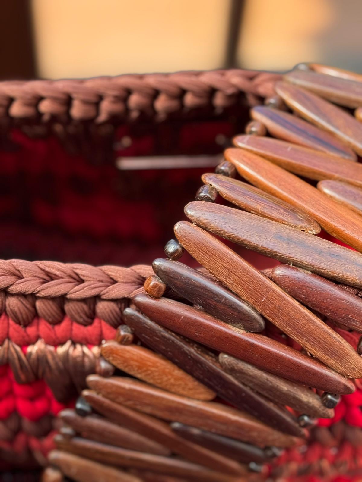 Handwoven on an eco-leather base, it combines strips of varying thicknesses and textures, in a palette inspired by earthy tones. Red appears as a pulse — deep, restrained, essential. Subtle accents of shine interrupt the weave, adding tension without excess.
