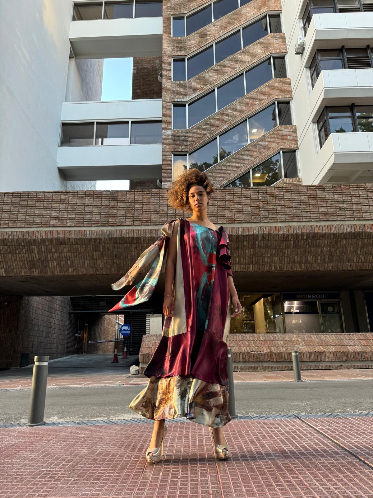 From our Zero Waste collection, we present this new dress made of sublimated satin with artwork by Inés Garibaldi, creator and designer of Las Raras.